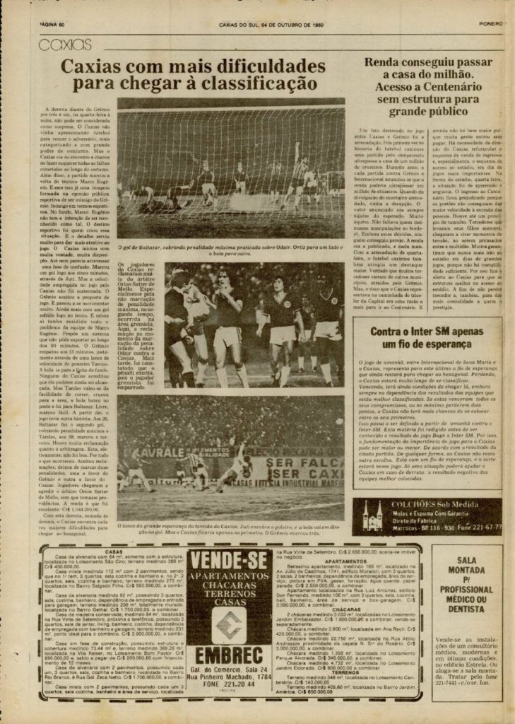 CAXIAS: Ortiz; Lauri, Ademir Gaúcho, Jerônimo e Segatto; Wílson, Liminha e Toninho (Tite); Gonçalves, Juti (Zé Luiz) e Zezinho; Tecnico: Marco Eugênio