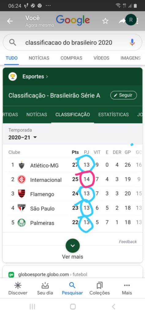 Se o Galo vencer sua partida atrasada fica 5 pontos do Inter.