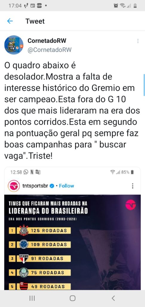O quadro abaixo é desolador.Mostra a falta de interesse histórico do Gremio em ser campeao.Esta fora do G 10 dos que mais lideraram na era dos pontos corridos.Esta em segundo na pontuação geral pq sempre faz boas campanhas para " buscar vaga".Triste! pic.twitter.com/iMugzy2dKE