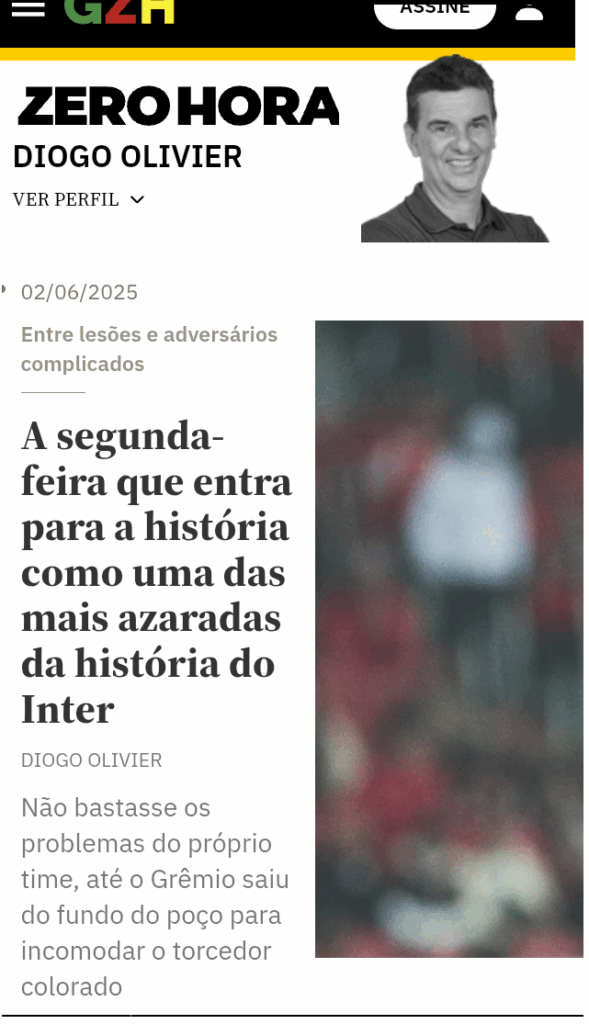 Na coluna em que se lamenta pela má sorte do seu time do coração deu um jeito de falar do Grêmio, que não tem qualquer relação com os resultados de sorteios da CONMEBOL e CBF, tampouco com a lista de pacientes do departamento médico do SCI.