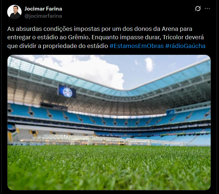 E, em resumo, quem se dispôs a usar máscara de oxigênio com filtro antimofo, relata que a nota de Jocimar CRECI não diz coisa com coisa: “…é só malabarismo retórico”, mas usado para “sacramentar que o Grêmio entrará dezembro sendo dono da ‘metade’ da Arena e de ‘metade’ do terreno do Olímpico”.